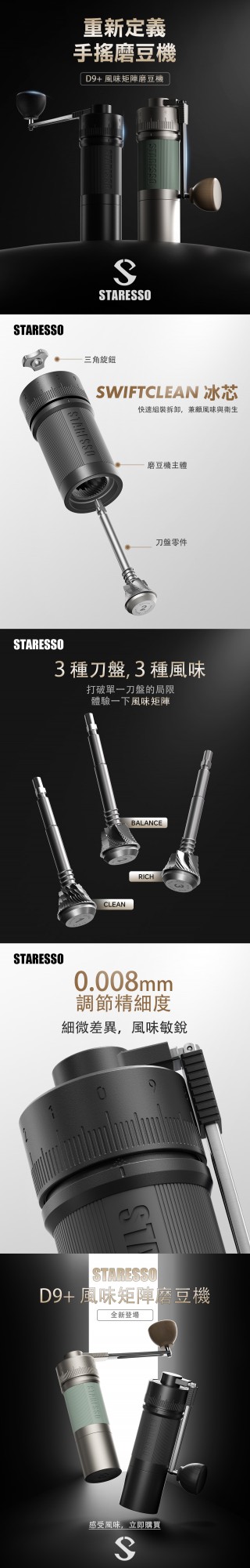 D9+ 風味矩陣磨豆機,以多刀盤設計打造不同風味表現。Clean、Balance、Rich 三種刀盤可依沖煮需求自由切換,搭配 0.008mm 精細刻度調節,細微之差即可帶來明顯風味層次。結構穩定、研磨順暢,讓每一次手搖研磨都更加精準。