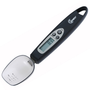 湯匙秤造型,適合勺取粉狀、顆粒狀等形態物品,可切換計算單位,公克/盎司,最小可至0.1g單位,單次最大重量300g,具累進計算模式,累進計算至3000g