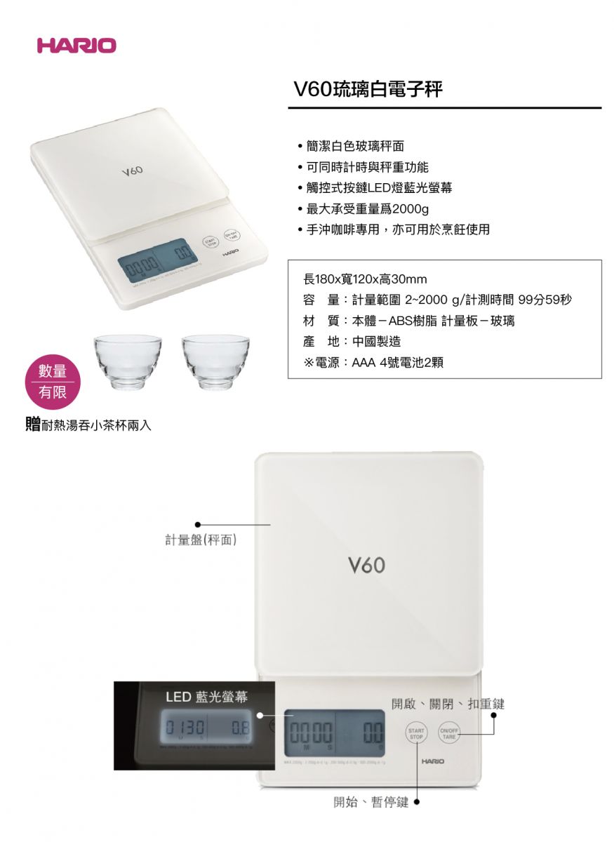 凡購買V60 琉璃白電子秤 就送 耐熱湯吞小茶杯一組(2入)